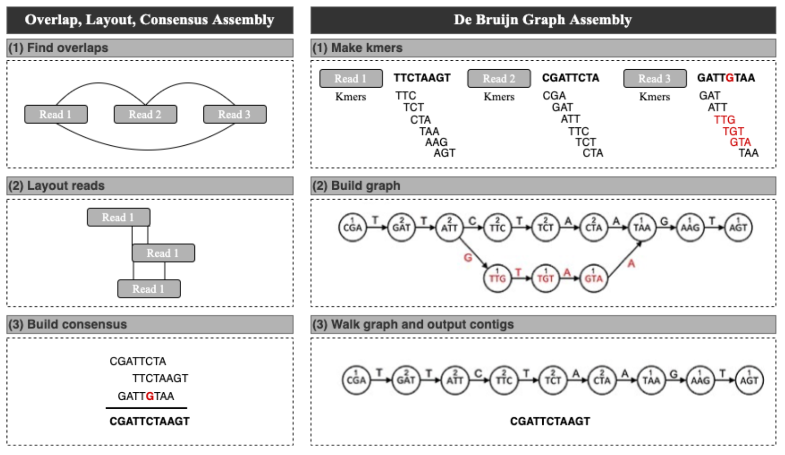 Approaches to de novo genome assembly. In Overlap, Layout, Consensus assembly, (1) overlaps are found between reads and an overlap graph constructed (edges indicate overlapping reads). (2) Reads are laid out into contigs based on the overlaps (lines indicate overlapping portions). (3) The most likely sequence is chosen to construct the consensus sequence. In the De Bruijn graph assembly, (1) reads are decomposed into kmers of a determined size by sliding a window of size k (in here of k=3) across the reads. (2) The kmers become vertices in the De Bruijn graph, with edges connecting overlapping kmers. Polymorphisms (red) form branches in the graph. A count is kept of how many times a kmer is seen, shown here as the numbers above kmers. (3) Contigs are built by walking the graph from the edge nodes. A variety of heuristics handle branches in the graphs—for example, low coverage paths, as shown here, may be ignored. Adapted from Ayling et al., 2020.