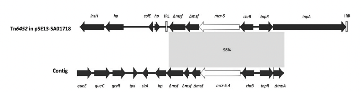 Comparative analysis of the genetic environment of mcr-5 between the reference plasmid pSE13-SA01718 (accession no. KY807921.1) and the annotated hybrid metagenome contig (accession no. MK965519). The contig carrying the mcr-5.4 gene consists of the following putative gene products: 7-carboxy-7-deazaguanine synthase (queE), 7-cyano-7-deazaguanine synthase (queC), glycine cleavage system transcriptional antiactivator GcvR (gcvR), thiol peroxidase (tpx), sulphurtransferase TusA family protein (sirA), hypothetical protein (hp), truncated MFS-type transporter (Dmsf), lipid A phosphoethanolamine transferase (mcr-5.4), ChrB domain protein (chrB), transposon resolvase (tnpR) and truncated transposon transposase (DtnpA). Areas with 98% identity between sequences are represented in light grey. Arrows indicate the position and direction of the genes. The transposon Tn6452 sequence in the reference plasmid pSE13-SA01718 is bounded by inverted repeats: IRL and IRR.Source: Fleres et al., 2019.