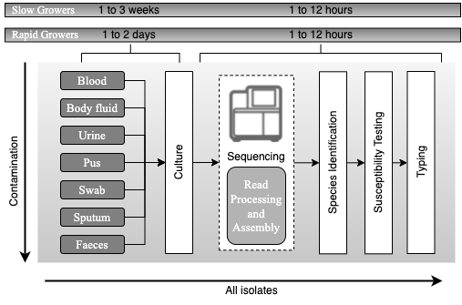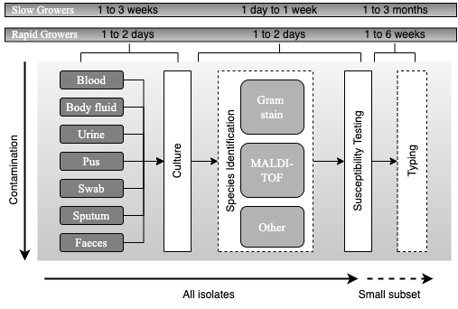 Principles of current processing of bacterial pathogens. Schematic representation of the current workflow for processing samples for bacterial pathogens is presented, with high complexity and a typical timescale of a few weeks to a few months. Samples that are likely to be normally sterile are often cultured on rich medium that will support the growth of any culturable organism. Samples contaminated with colonising flora present a challenge for growing the infecting pathogen. Many types of culture media (referred to as selective media) are used to favour the growth of the suspected pathogen. Once an organism is growing, the likely pathogens are then processed through a complex pathway that has many contingencies to determine species and antimicrobial susceptibility. Broadly, there are two approaches. One approach uses MALDI-TOF for species identification prior to setting up susceptibility testing. The other uses Gram staining followed by biochemical testing to determine species; susceptibility testing is often set up simultaneously with doing biochemical tests. Lastly, depending on the species and perceived likelihood of an outbreak, a small subset of isolates may be chosen for further investigation using a wide range of typing tests. Adapted from Didelot et al., 2012