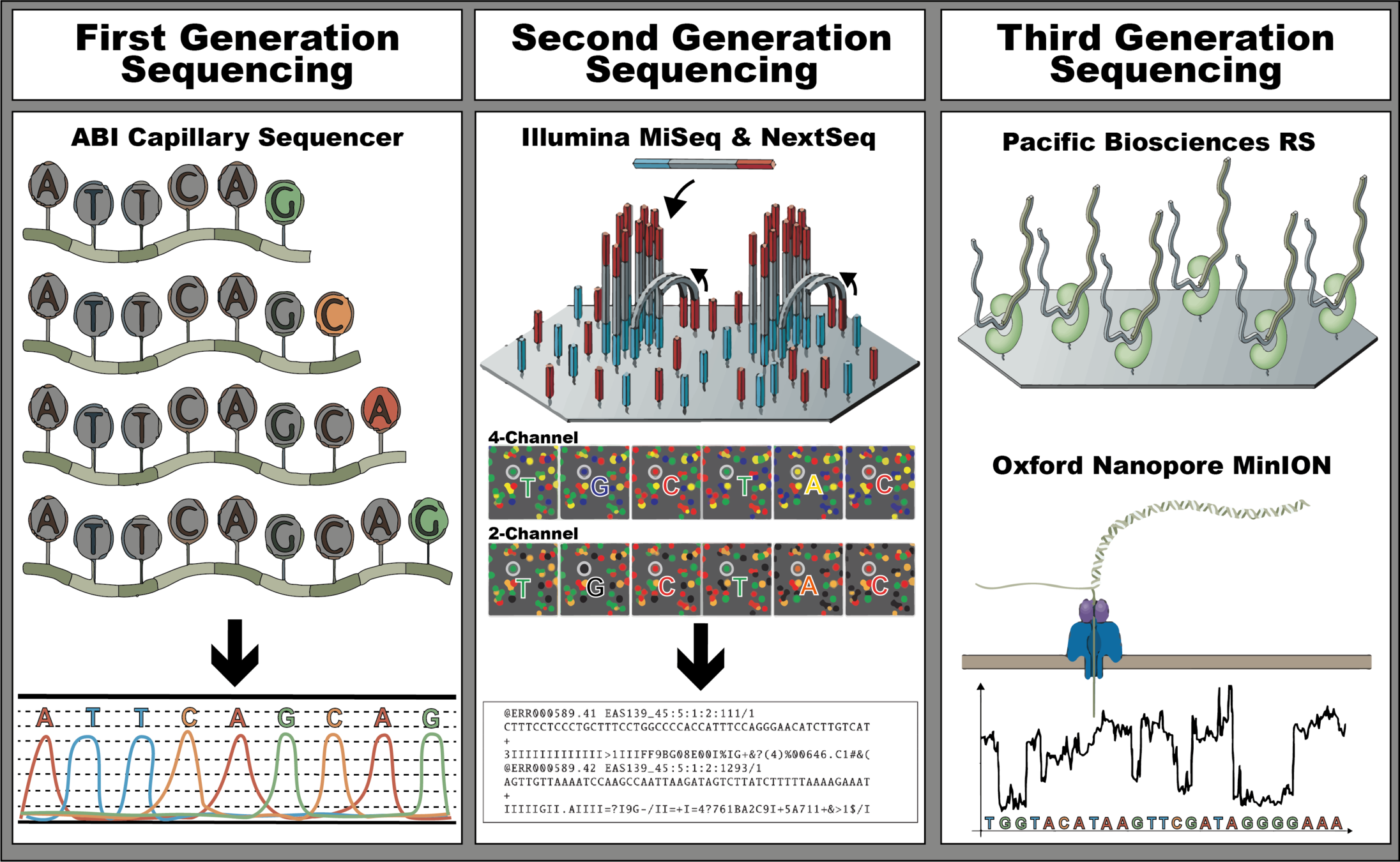 The three revolutions in sequencing technology that have transformed the landscape of bacterial genome sequencing. The first-generation, also known as Sanger sequencers, is represented by the ABI Capillary Sequencer (Applied Biosystems). The second-generation, also known as high-throughput sequencers, is represented by the MiSeq, a 4-channel sequencer, and the NextSeq, a 2-channel sequencer (Illumina), both sequencing by synthesis instruments. These instruments allow the sequencing of both ends of the DNA fragment. Lastly, the third-generation, also known as long-read sequencers, is represented by Pacific Bioscience BS sequencer and Oxford Nanopore MinION sequencer. Adapted from Hagemann, 2015; Nicholas J. Loman and Pallen, 2015; Goodwin et al., 2016; Wang et al., 2021; Metzker, 2010; Xu et al., 2020.