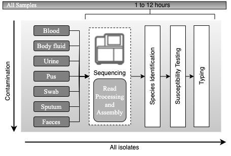 Principles of current processing of bacterial pathogens based on whole-genome sequencing. Schematic representation of the workflow for processing samples for bacterial pathogens after the adoption of whole-genome sequencing, with an expected timescale that could fit within a single day. The culture steps would be the same as currently used in a routine microbiology laboratory. Once a likely pathogen is ready for sequencing, DNA will be extracted, taking as little as 2 hours to prepare the DNA for sequencing. After sequencing, the main processes for yielding information will be computational. Automated sequence assembly algorithms are necessary for processing the raw sequence data, from which species, relationship to other isolates of the same species, antimicrobial resistance profile and virulence gene content can be assessed. All the results will also be used for outbreak detection and infectious diseases surveillance Adapted from Didelot et al., 2012