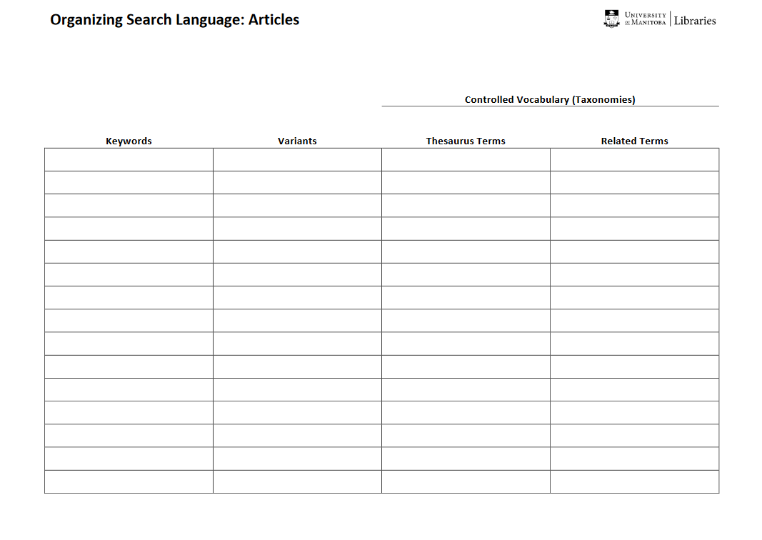 - Search with keywords to find relevant books or articles. Use their subject headings to find similar materials.