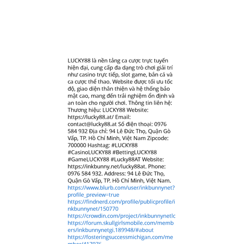 Website: https://inkbunny.net/lucky88at. LUCKY88 là nền tảng ca cược trực tuyến hiện đại, cung cấp đa dạng trò chơi giải trí như casino trực tiếp, slot game, bắn cá và ca cược thể thao. Website được tối ưu tốc độ, giao diện thân thiện và hệ thống bảo