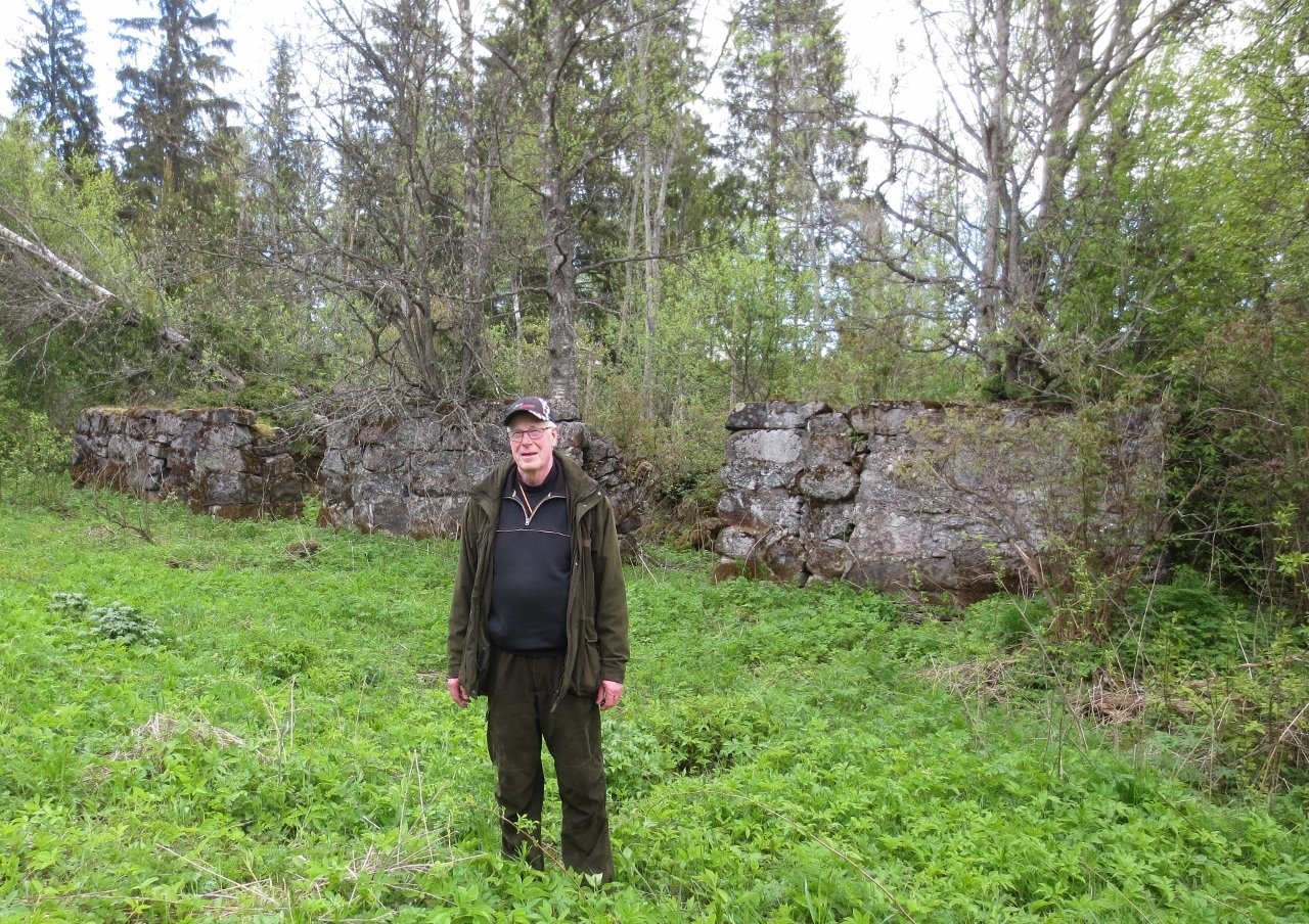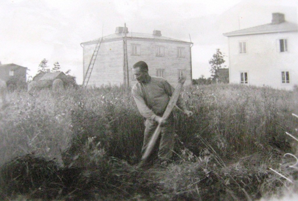 ISOISÄNI MATTI JUNNA NIITTÄMÄSSÄ HEINÄÄ LEHMÄLLE IMATRAN JAKOLASSA.