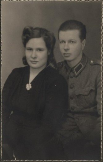 KERTTU JA AARNE JUNNAN HÄÄVALOKUVA JÄÄSKEN JAKOLASSA VUONNA 1946.