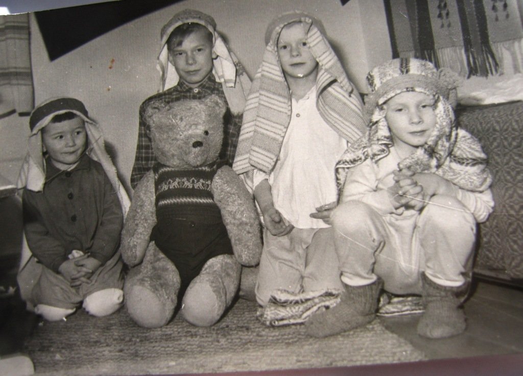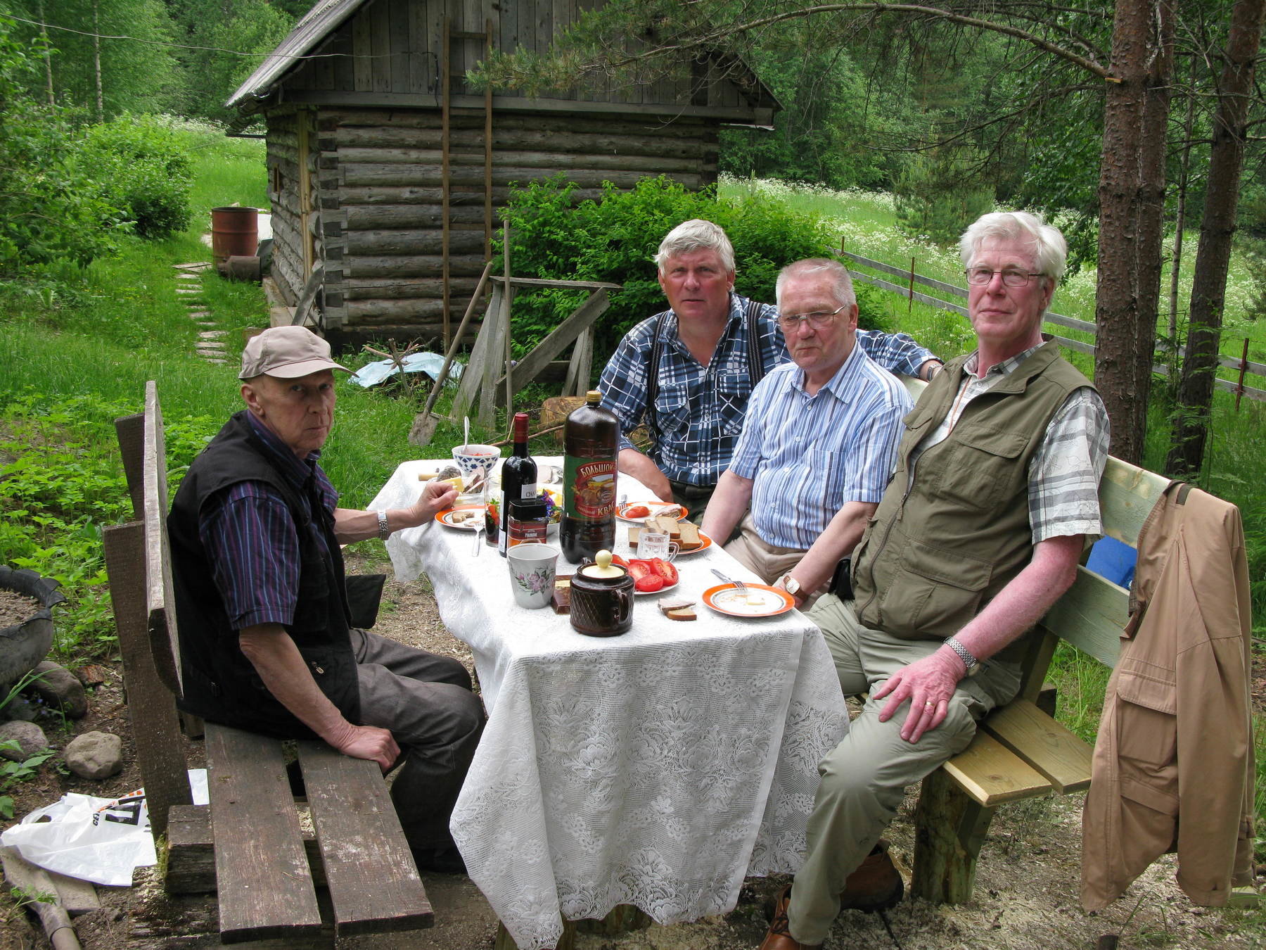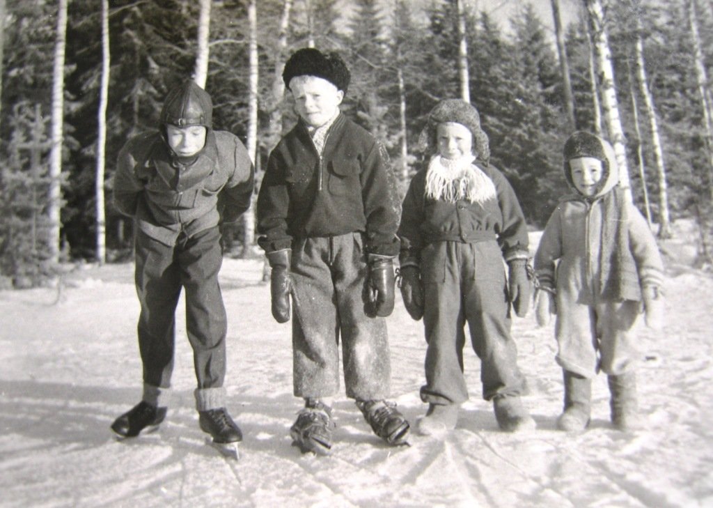 LUISTELEMASSA VERTASEN METSÄN JÄÄLLÄ. JUHANI S.1947, VEIKKO S.1950, LAURI S.1952 JA PEKKA S.1953.