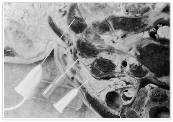 Midway between the posterior border of the sternomastoid and the dorsal midline. Depth of 3.0-3.5 cm.