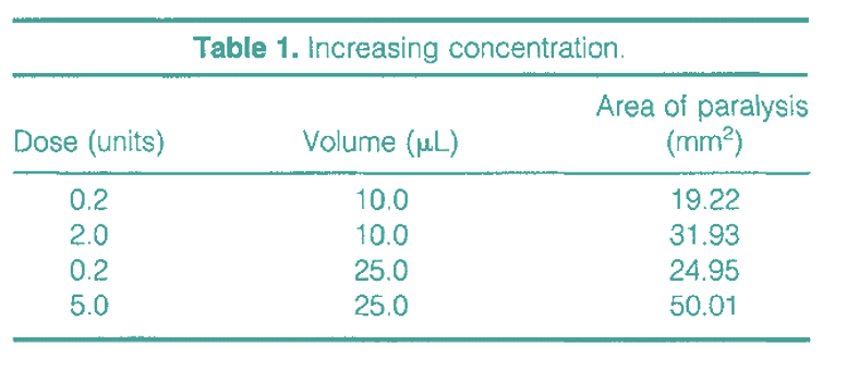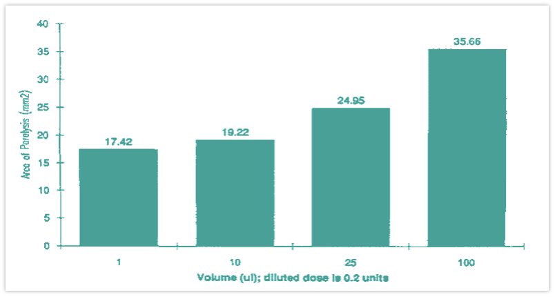 Paralysis doubles with a 25-fold increase in dose (constant volume), whereas a 100-fold increase in volume (constant dose) is needed to double paralysis