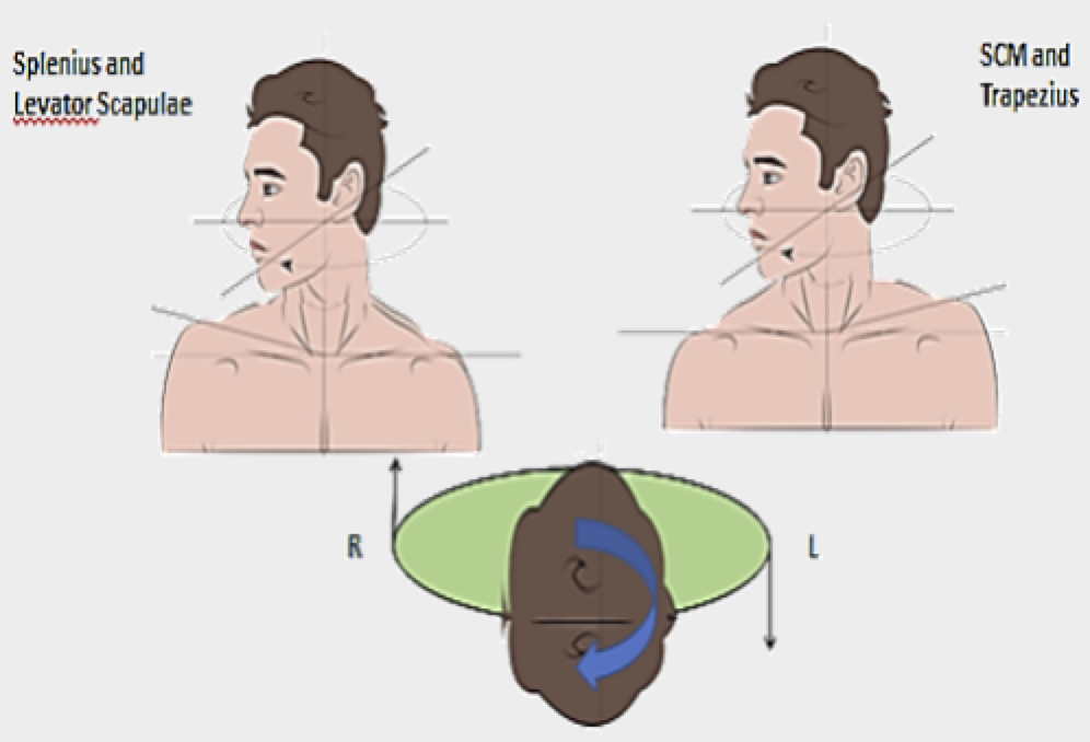 - Shoulder elevation on the side of rotation therefore suggesting dystonic levator scapulae