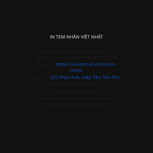 In Việt Nhật cung cấp dịch vụ in tem nhãn uy tín, giá rẻ, chất lượng, giao hàng nhanh chóng. Website: https://invietnhat.vn/in-tem-nhan/ SĐT:0975555 717 Người đại diện: Nguyễn Viết Chiến Địa chỉ: 252 Phan Anh, Hiệp Tân, Tân Phú, Thành phố Hồ Chí Minh