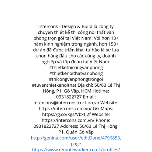 Website: https://intercons.com.vn/ Intercons - Design & Build là công ty chuyên thiết kế thi công nội thất văn phòng trọn gói tại Việt Nam. Với hơn 10+ năm kinh nghiệm trong ngành, hơn 150+ dự án đã được triển khai tự hào là sự lựa chọn hàng đầu cho