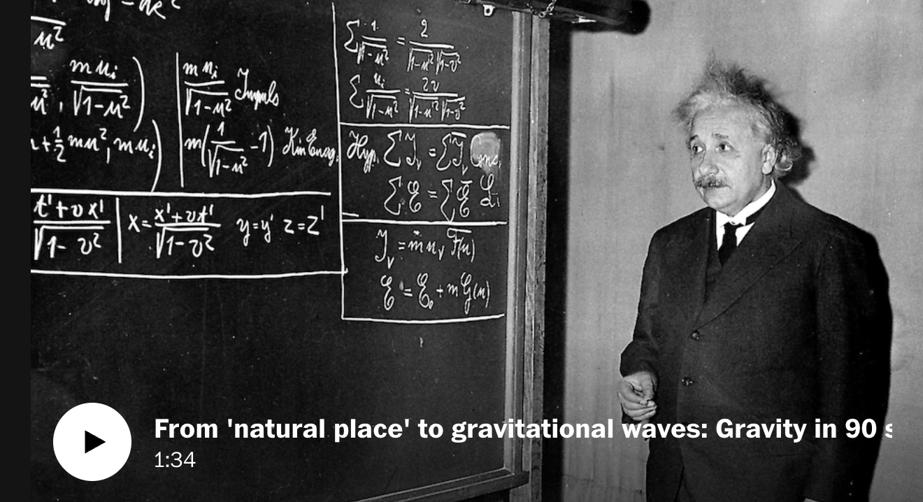 大物体的引力扭曲空间和时间,或称为“时空”,就像保龄球在弹跳床上滚动时改变其形状一样。较小的物体因此会以不同的方式移动——就像弹跳床上朝向保龄球大小的凹陷螺旋而去的弹珠,而不是坐在平坦的表面上。