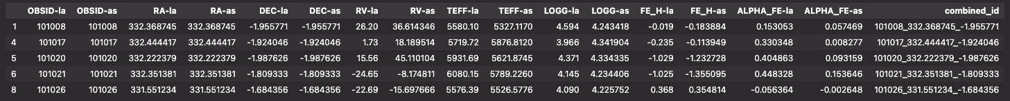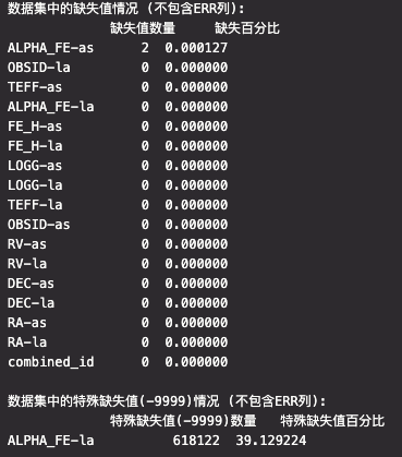 通过这种方式,我们成功构建了包含理论预测值和实测值的综合数据集,为后续分析提供了基础。每个参数均以"-la"(LAMOST实测值)和"-as"(AstroOne理论值)后缀区分。