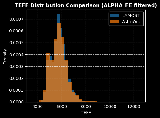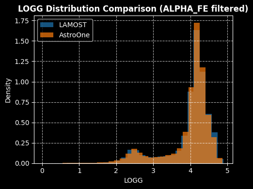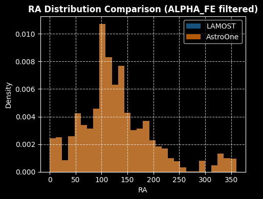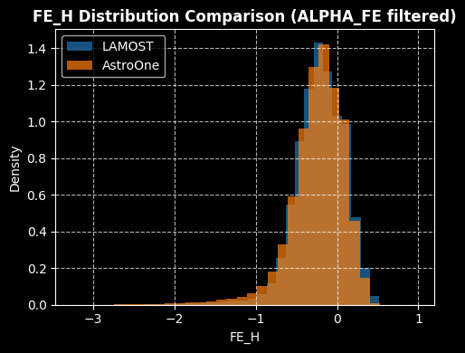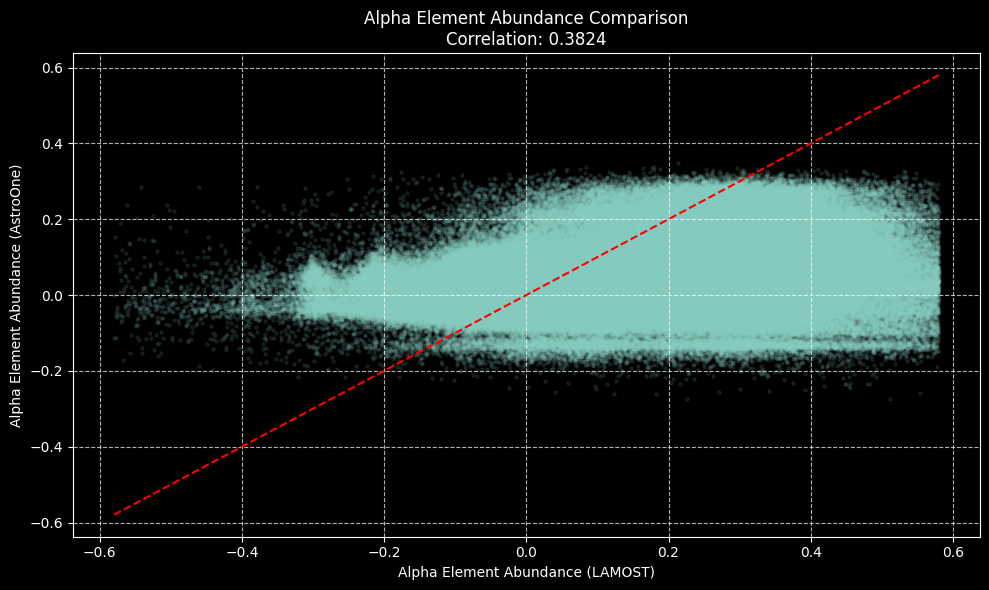 1. 分布模式:LAMOST数据集的Alpha元素丰度分布呈现出更明显的双峰结构,对应于银河系盘和晕的恒星种群;而AstroOne数据集的分布相对更为连续