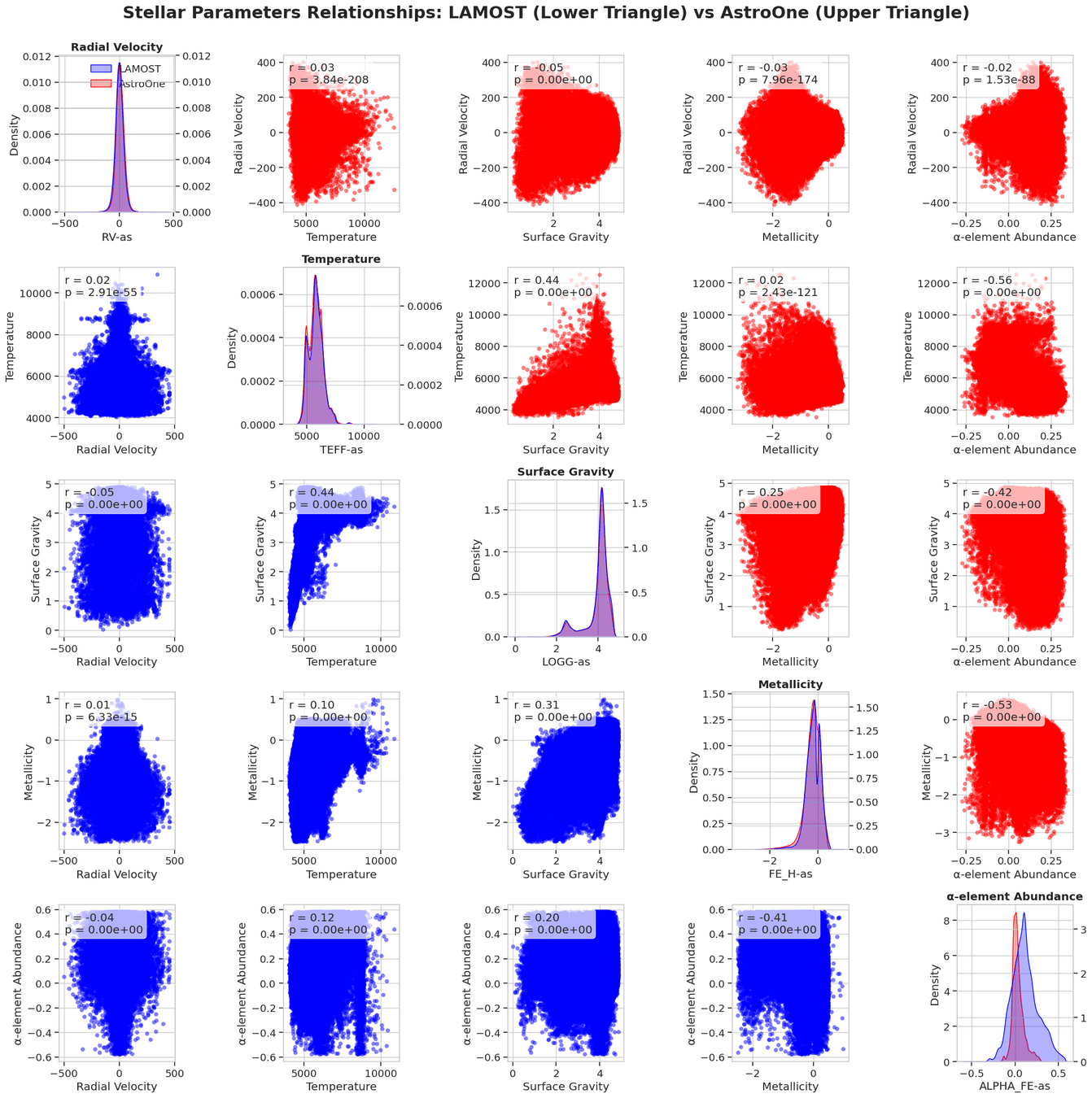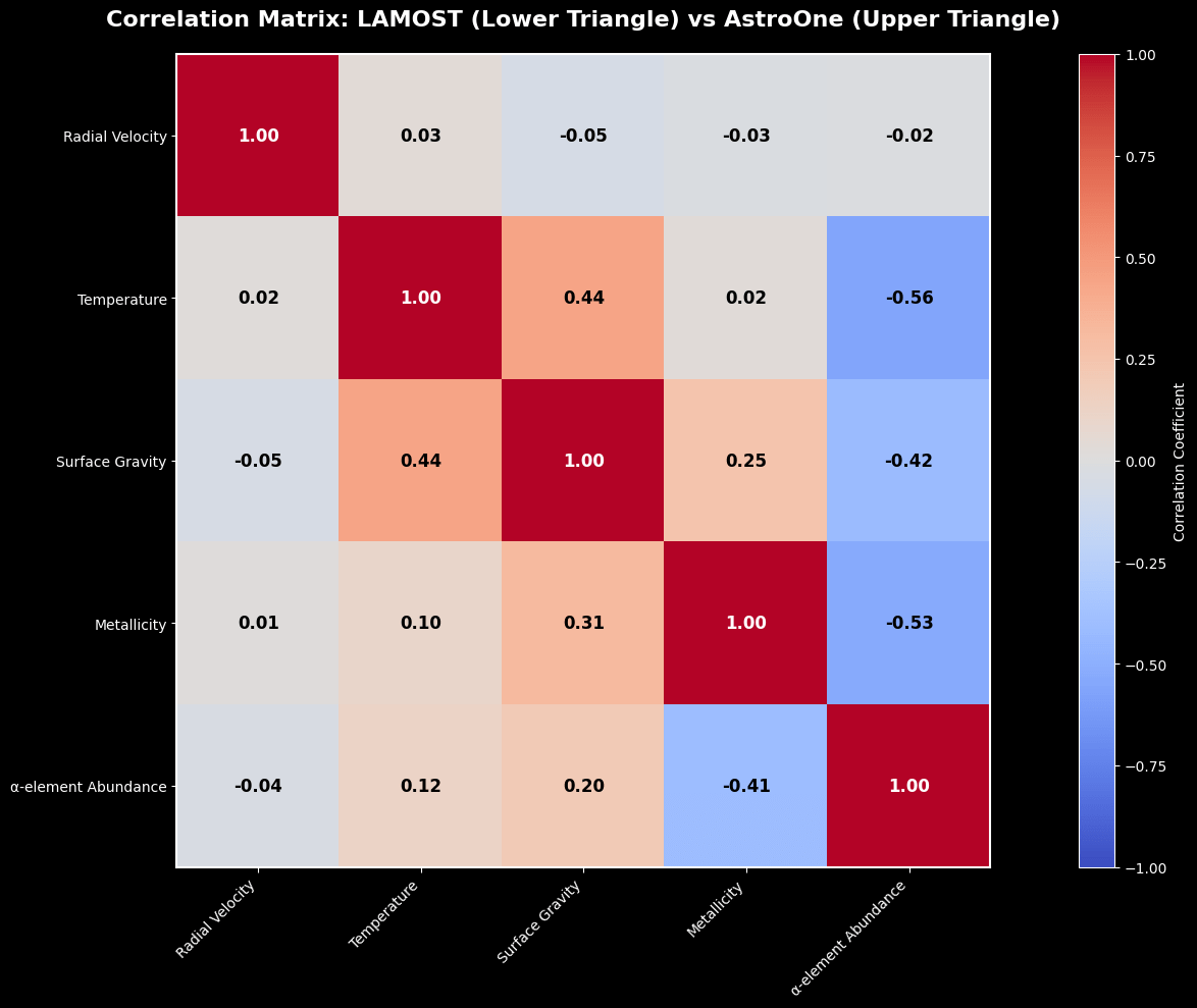 从相关性矩阵图中,我们可以观察到LAMOST和AstroOne两个数据集之间的参数相关性差异: