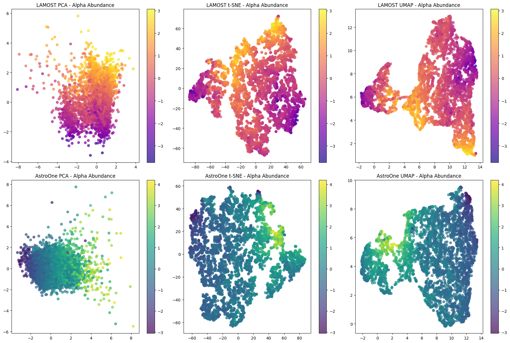 Alpha元素丰度在AstroOne的t-SNE空间中形成了较为模糊的边界,聚类结构不如LAMOST数据明显