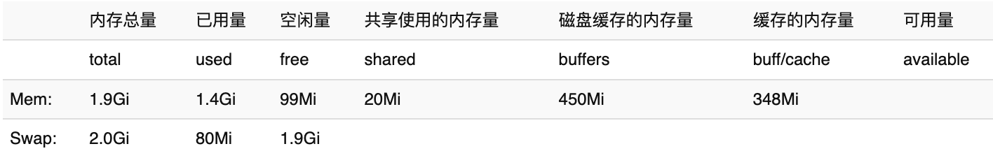 第4行:物理内存总量、内存空闲量、内存使用量、作为内核缓存的内存量。