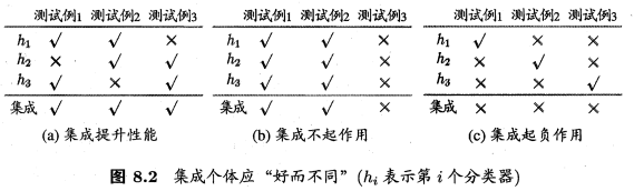 下图中西瓜书中的实例对该问题进行了说明,采用简单投票的方法确定融合模型的结果,图(a)子模型满足“好”和“不同”两个条件,图(b)中子模型不满足“不同”的条件,图(c)子模型不满足“好”的条件。