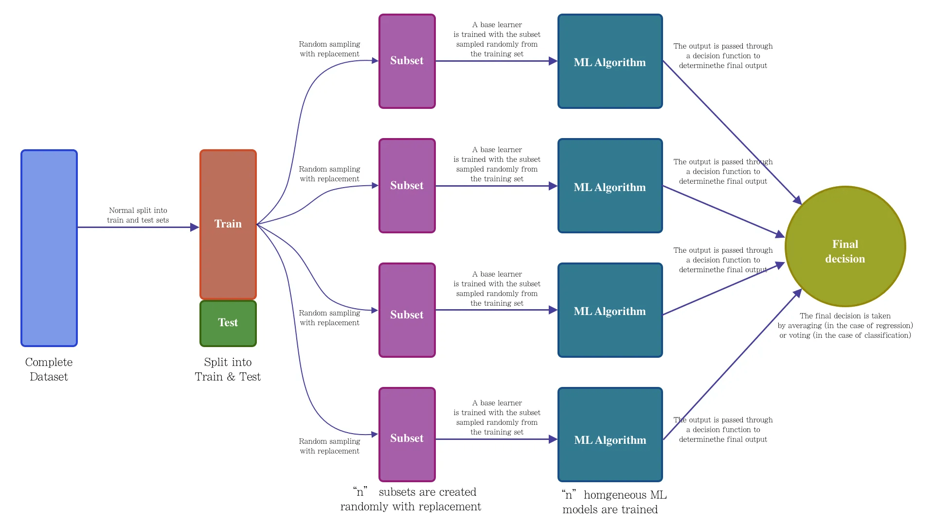 同质模型(Base Learner):这些模型都是同一类型的,例如都是决策树或者都是神经网络。同质模型通常通过引入随机性来增加多样性,例如在随机森林中,我们通过自助采样(Bootstrap Sampling)和随机特征选择来生成多个不同的决策树