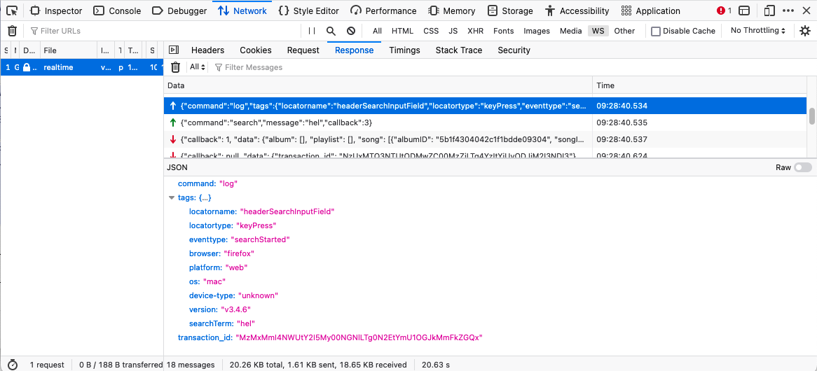 { "tags": { "album": "5403b0c2f5f5680200b45d89", "song": "5403b0c2f5f5680200b45d91", "locatorname": null, "eventtype": "startTrackPlayback", "artist": "5403b0c2f5f5680200b45d87", "locatortype": "buttonClick", "user": null, "device": "windows-unknown", "browser": "chrome" }, "timestamp": 1427223676.554661, "host": "localhost", "message": null, "time_taken": null, "client": "UNKNOWN", "exc_info": null, "logger": "analytic", "type": "realtime_api", "levelname": "INFO" }