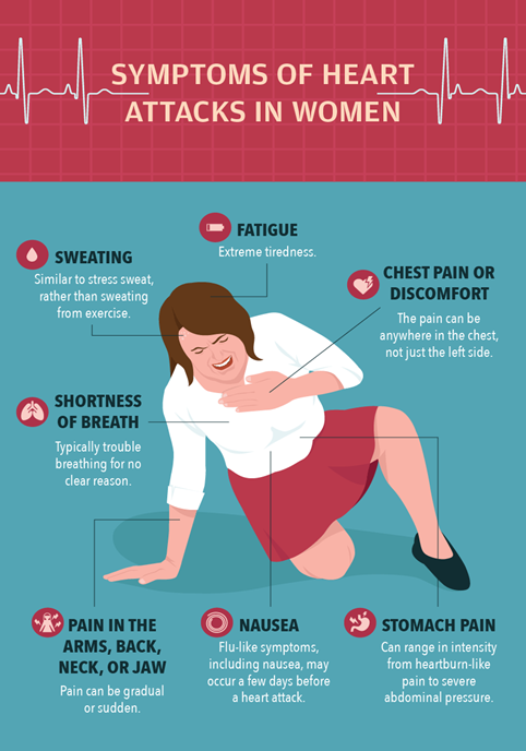 - 71% of women experience early warning signs of heart attack with atypical symptoms, sometimes flu-like symptoms, nausea, epigastric pain, and no Chest Pain