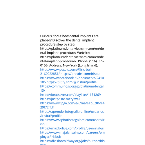 Website: https://platinumdentalvietnam.com/en/dental-implant-procedure/https://platinumdentalvietnam.com/en/dental-implant-procedure/ Curious about how dental implants are placed? Discover the dental implant procedure step by step. https://platinumdentalvietnam.com/en/dental-implant-procedure/ Phone: (516) 55