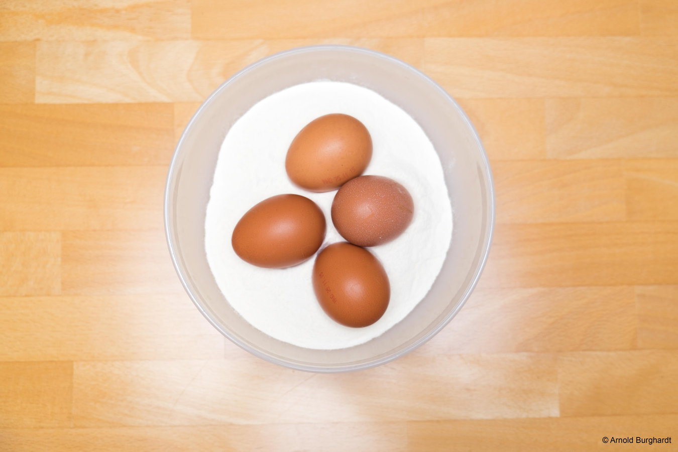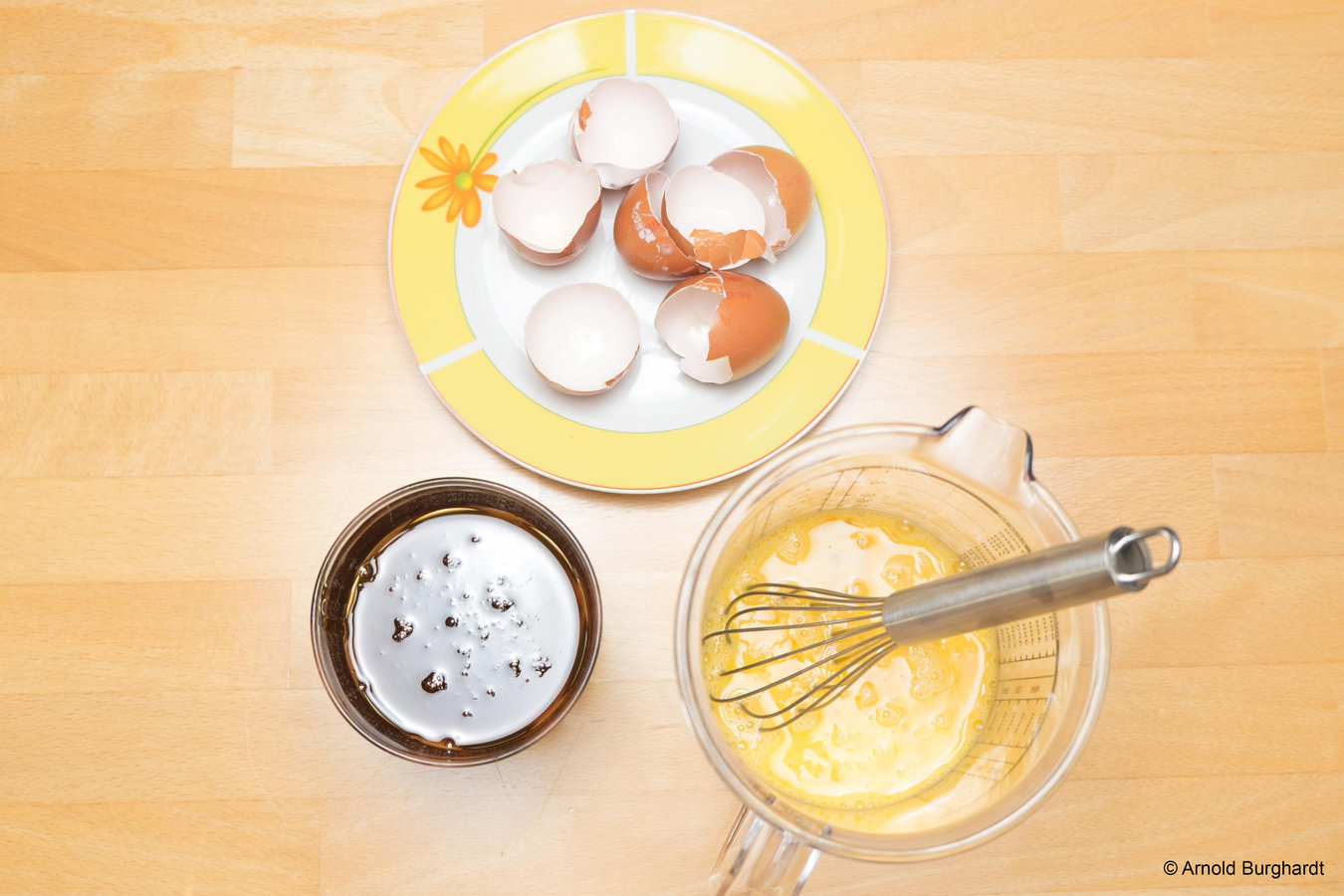 Erhitzen Sie zuerst den Honig in einem Topf Wasser, bis dieser leicht flüssig wird. Dann schlagen Sie die Eier auf und vermischen diese mit dem zuvor erhitzten Honig.
