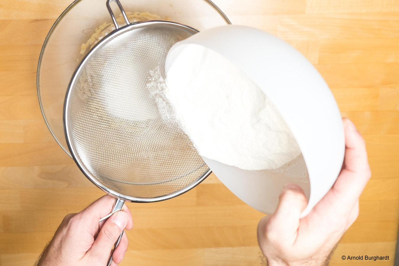 Mehl darüber sieben und den Teig kneten.