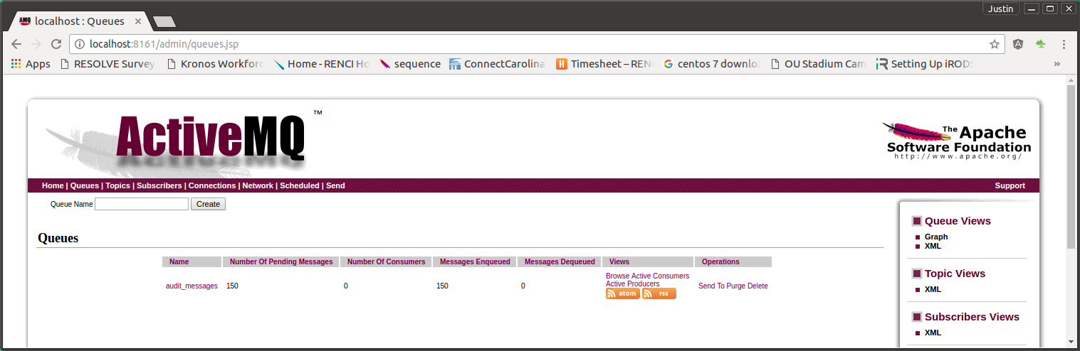 In a browser, navigate to http://localhost:8161/admin/ (the default login/password is admin/admin) and click on "Queues". Perform some iCommands and see messages being added to the "audit_messages" queue.