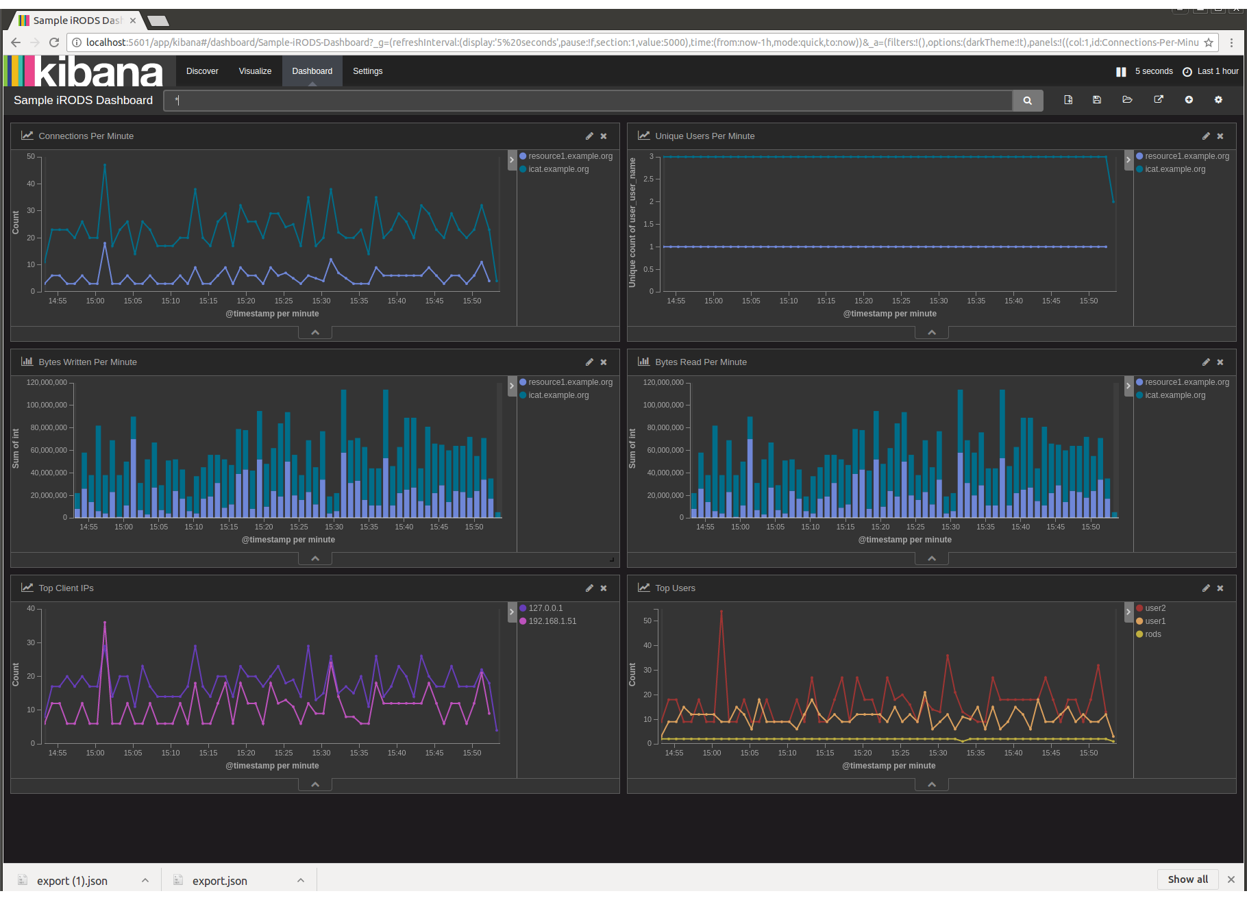 Kibana is used to query and display information graphically from our Elasticsearch database. We will use a Kibana dashboard to monitor our iRODS grid.