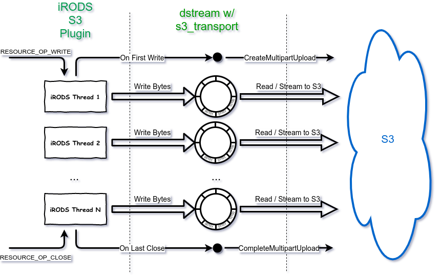 - If parallel transfer on write is performed in iRODS, a multipart upload is started and each transfer thread streams data directly to S3 for its part.