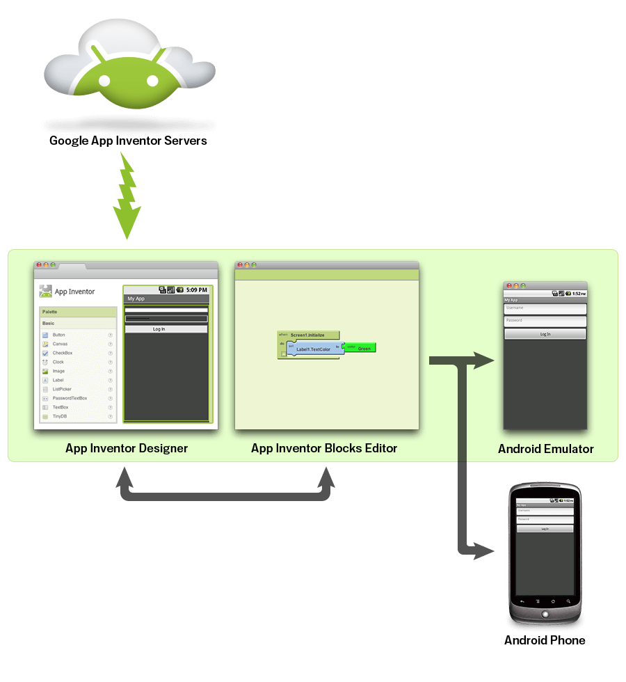 App Inventor lets you develop applications for Android phones using a web browser and either the connected phone or emulator. The App Inventor servers store your work and help you keep track of your projects.