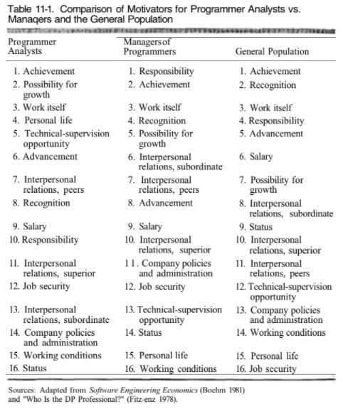 Achievement, possibility for growth, and work itself are in the top five motivators for both developers and managers (although they prioritize the factors differently).