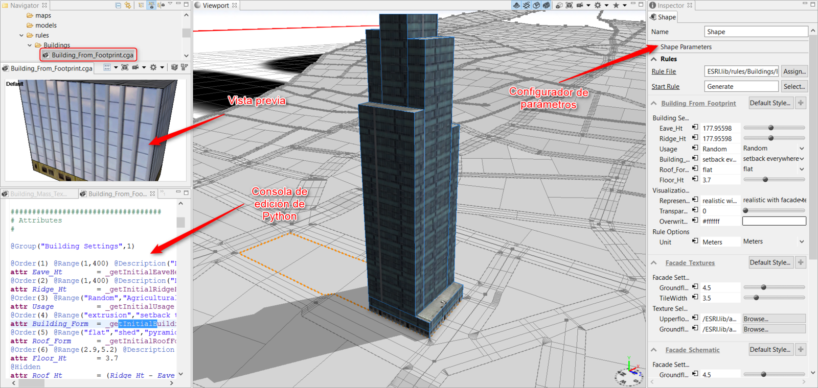 Permite ejecutar y configurar parámetros de reglas de CityEngine, pero no crear nuevas ni modificarlas.