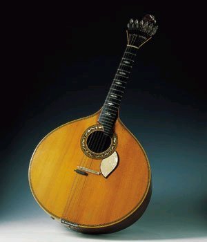 A guitarra portuguesa é um instrumento de música de 12 cordas em forma de pera que acompanha o fado , um estilo musical português.