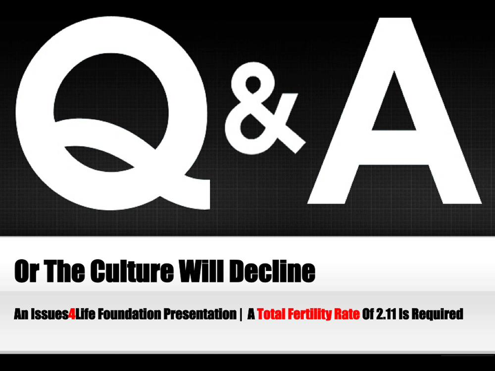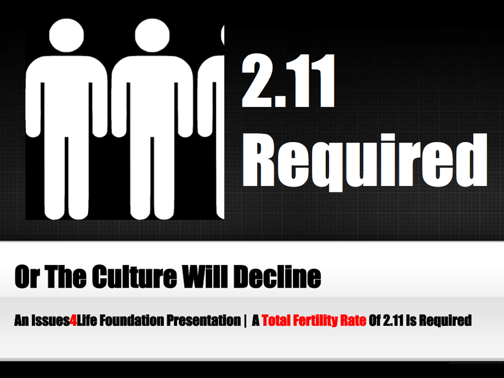 According to the Population Reference Bureau, the Total Fertility Rate (TFR) is defined as, “the average number of children a women would have assuming that current age-specific birth rates remain constant throughout her childbearing years.” Of simply put, in order for a culture to maintain itself for more than twenty-five (25) years a fertility rate of 2.11 children per family is required.
