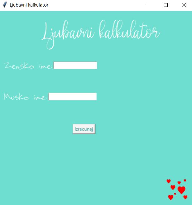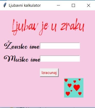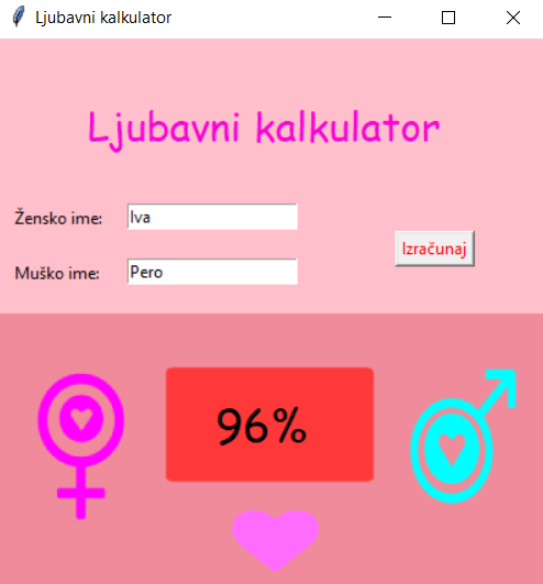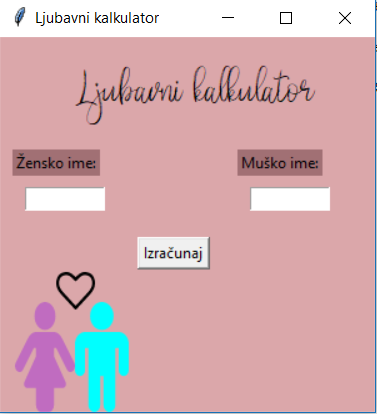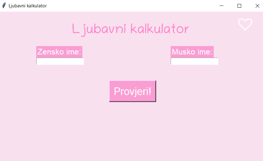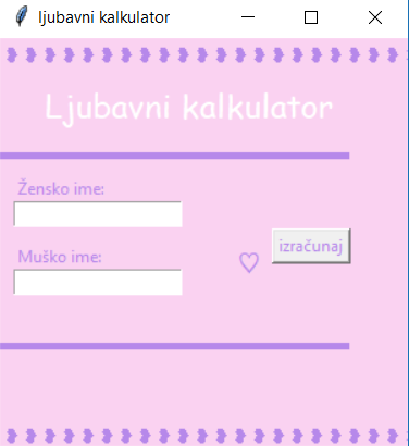 naslov= Label(prozor,text='Love calculator',background='#f9e0ef',fg='#fc79c5',font=('Chilanka', 26))