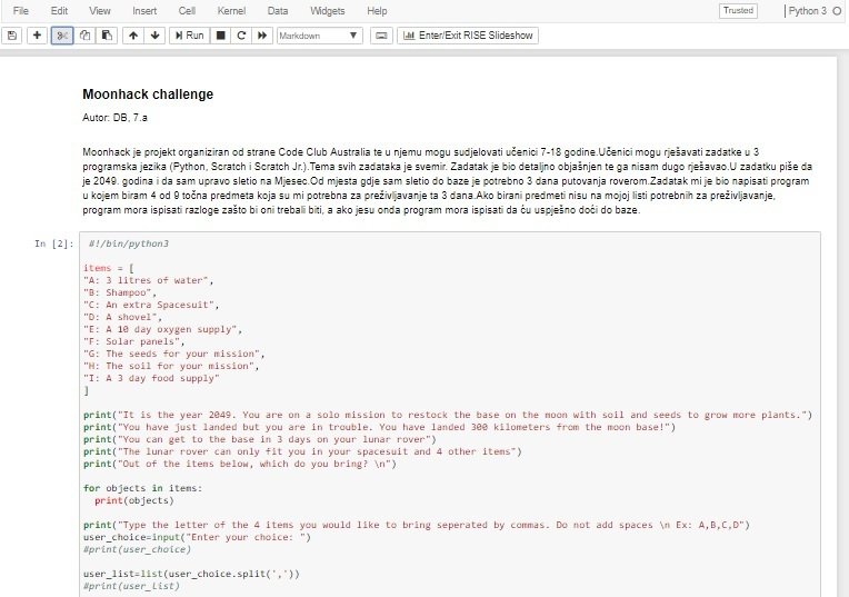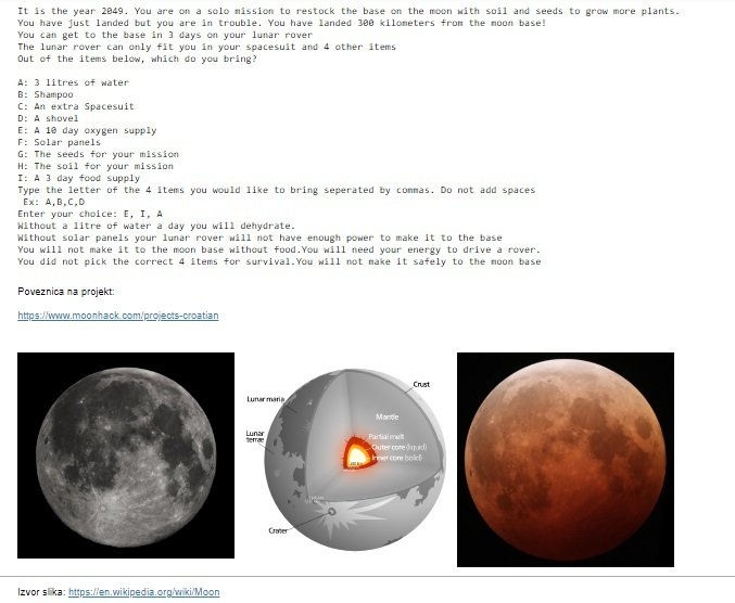 - Uz upute riješiti zadatak (kako preživjeti na Mjesecu 3 dana?)