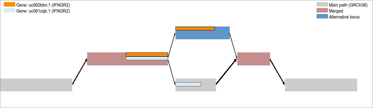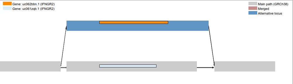 "Flanking" regions of the alternative locus have been merged with the main path, revealing that the two genes start at the same position.