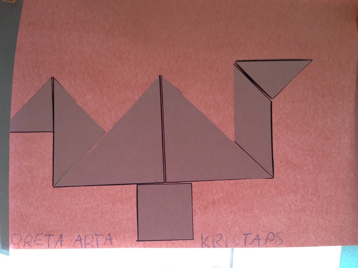 Mēs ar mammu spēlējām "Tangramu" un līmējām mammas mīļāko figūru uz lapas.