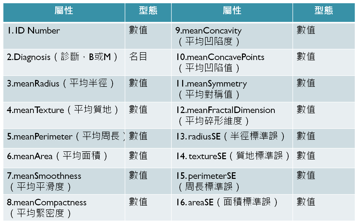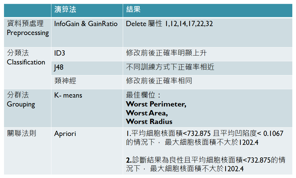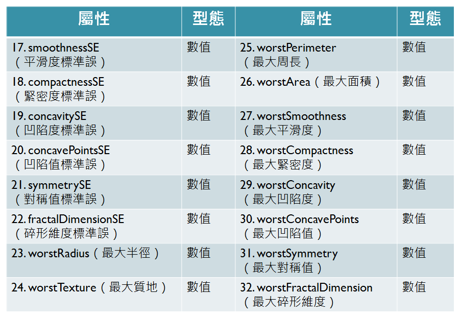 - 藉由乳房腫瘤切片上細胞核的各種特徵判斷屬於良性還是惡性腫瘤。