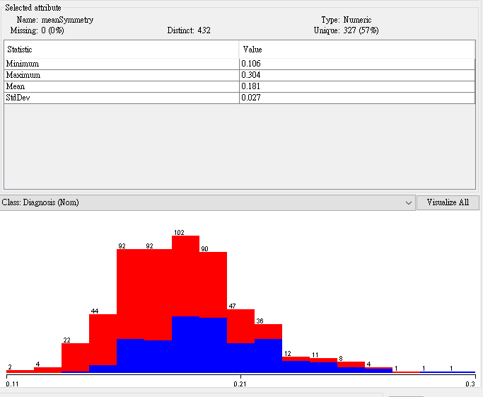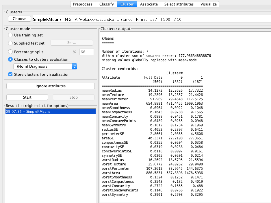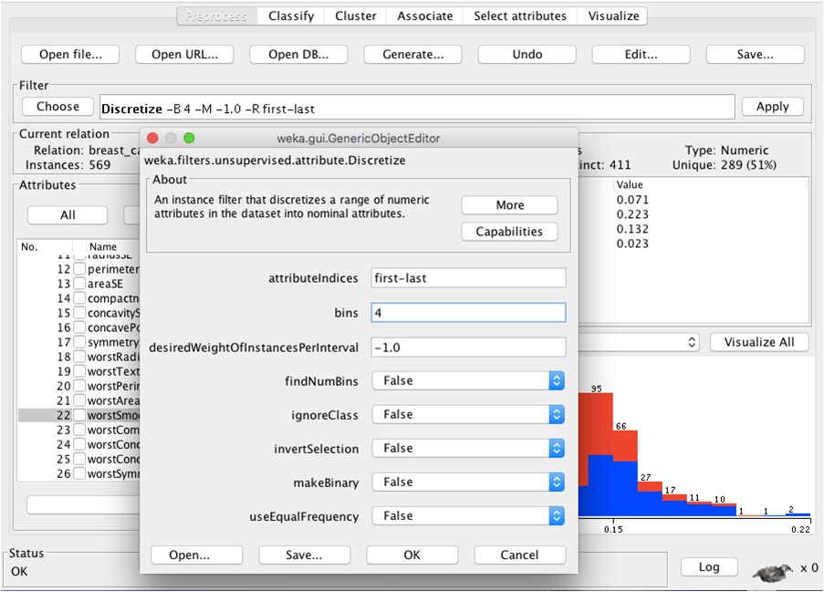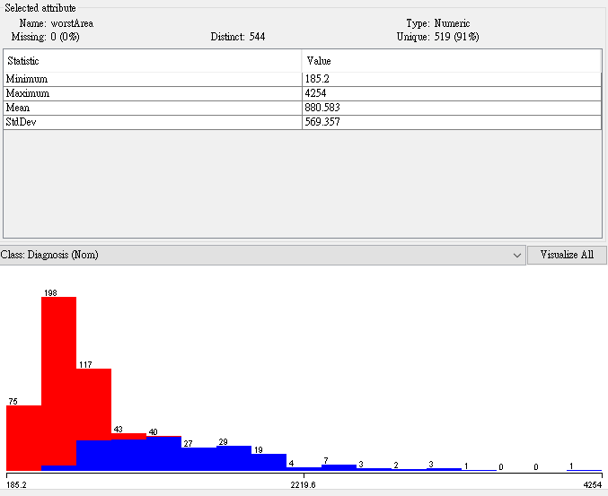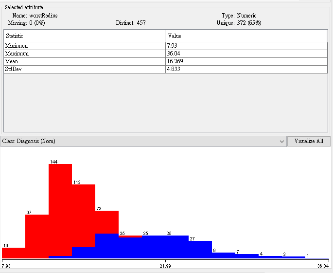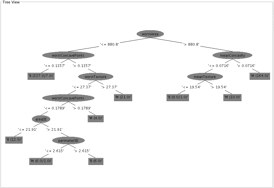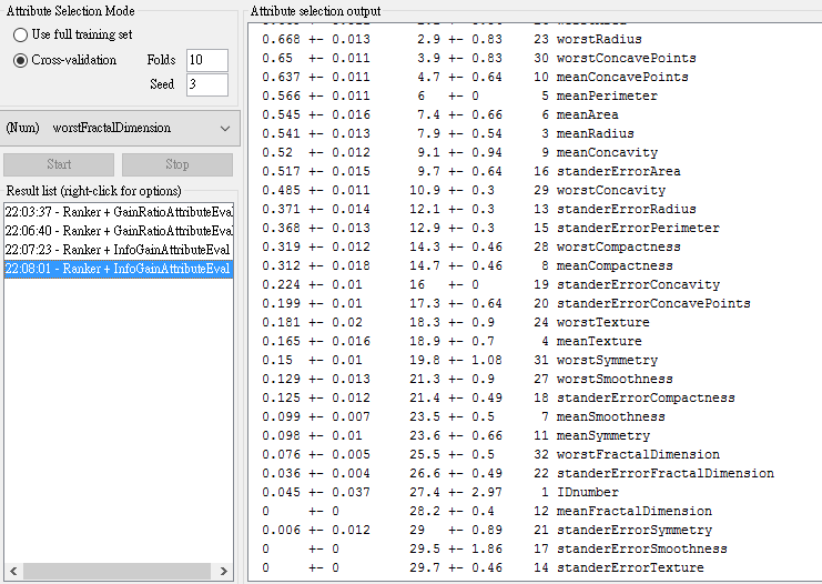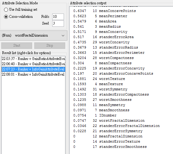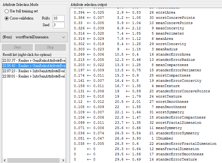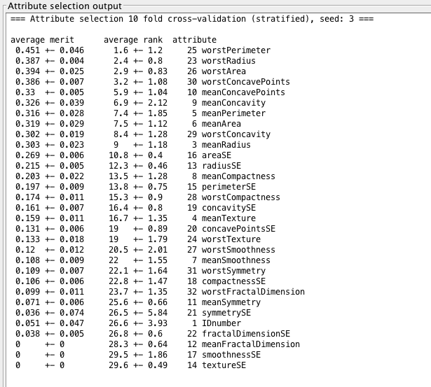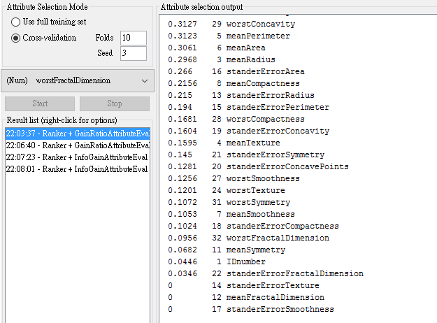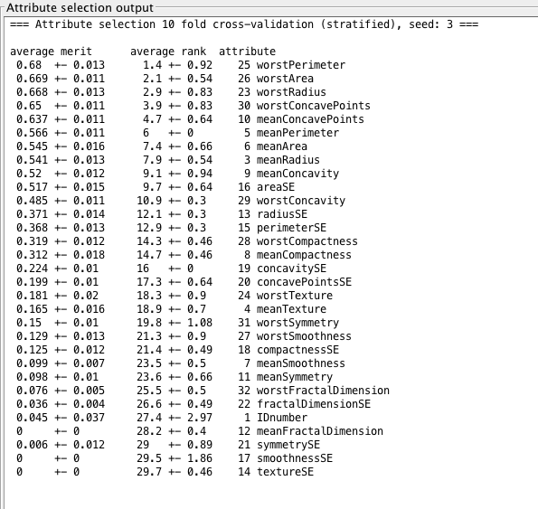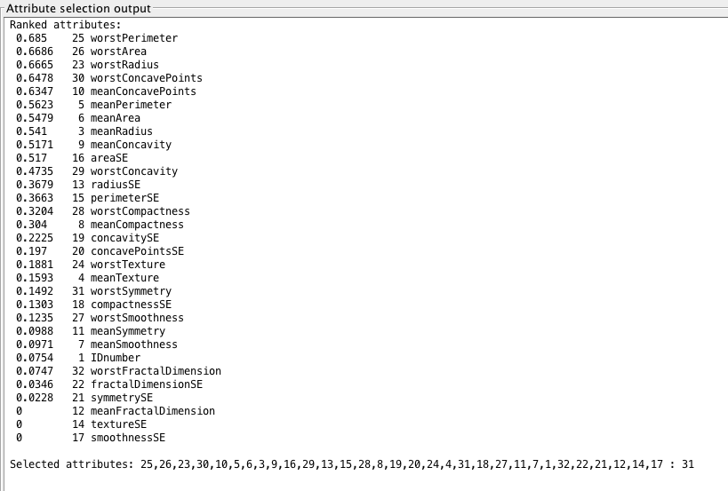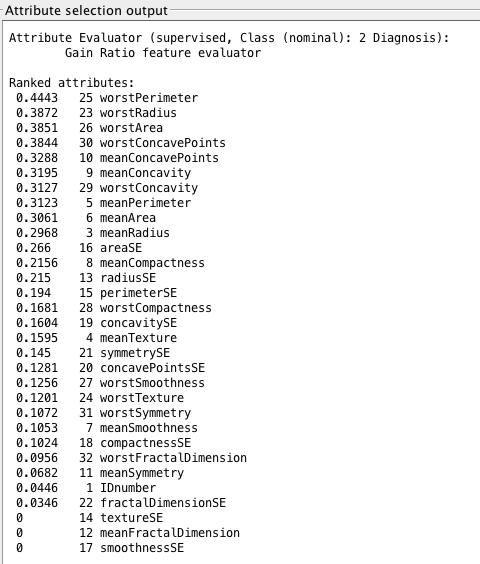 - From GainRatio : WorstPerimeter, WorstRadius, WorstArea,WorstConcavePoints, MeanConcavePoints