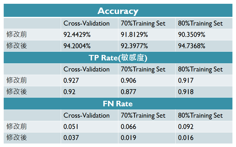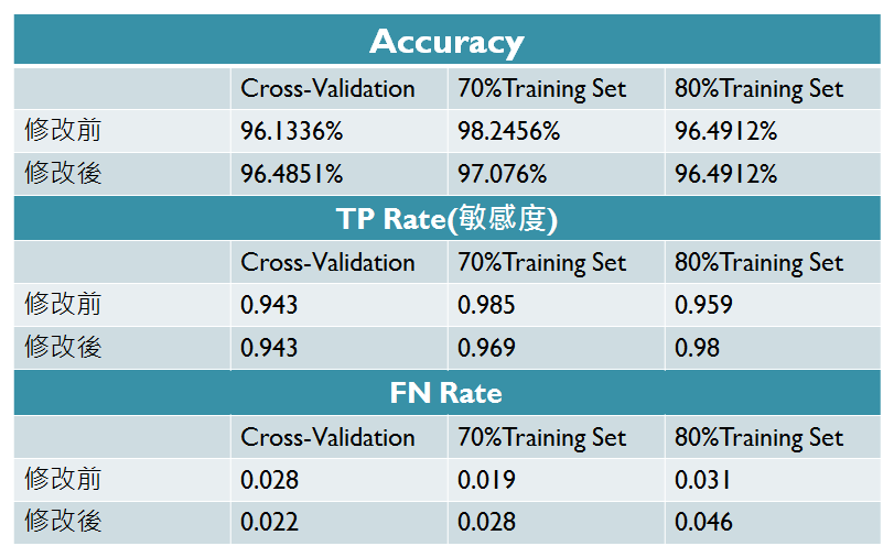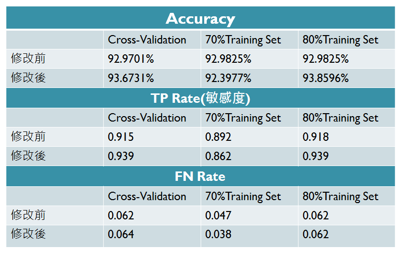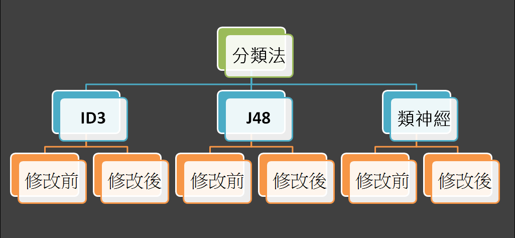 - The amount of accuracy change: ID3 > J48 > 類神經