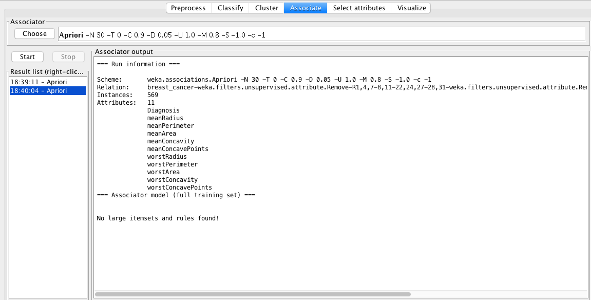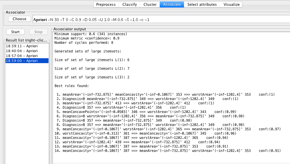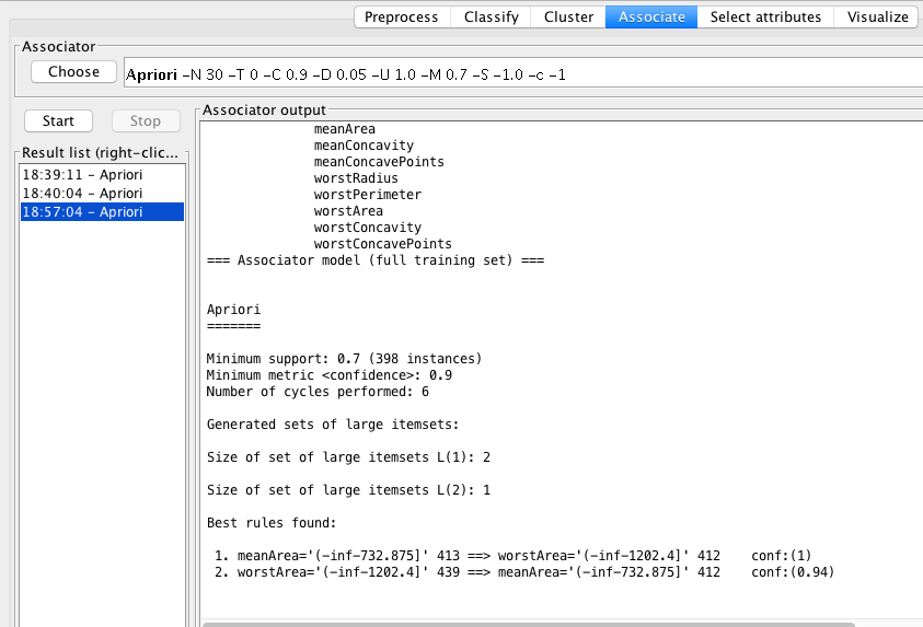 1. meanArea='(-inf-732.875]' 413 ==> worstArea='(-inf-1202.4]' 412 conf:(1)