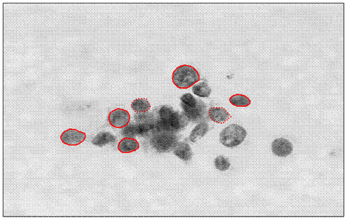 「採用細胞核輪廓之曲率、細胞核之面積、細胞核之緊密度,與細胞核之對比度,作為判別病變與否之特徵」