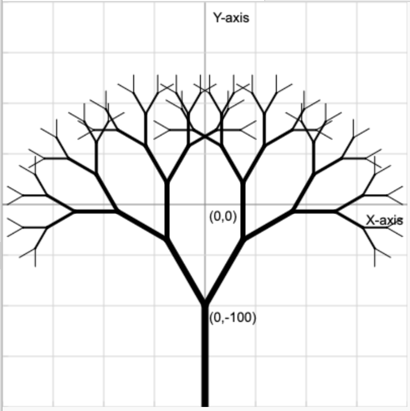 draw_branch(end_x, end_y, new_angle_right, new_length, new_width)It should become clear now that we are trying to solve our tree drawing problem using a recursive branch drawing function which calls itself to draw smaller, similar branches every time.