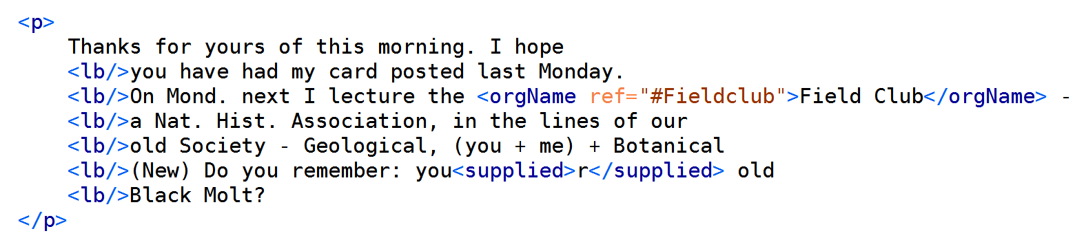 - Start-tags and end-tags are always mandatory (except there are combined start-and-end tags called 'empty elements' <pb/> <gap/>)