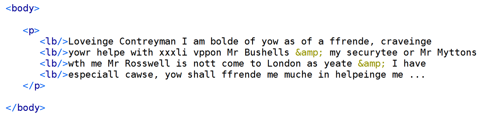 - core: p foreign hi desc gap unclear num date list item head note pb lb respStmt resp title choice abbr expan corr sic orig reg add