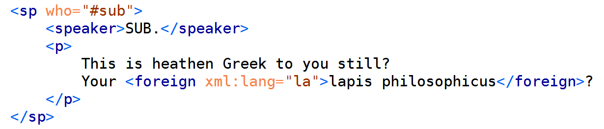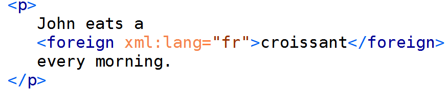 - @xml:lang specifies the language of any element, using an ISO standard code (e.g. ISO 639-1)