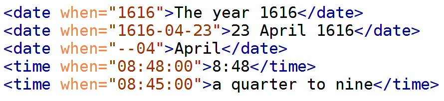 - <date> contains a date in any format @when contains the regularized form; YYYY-MM-DD